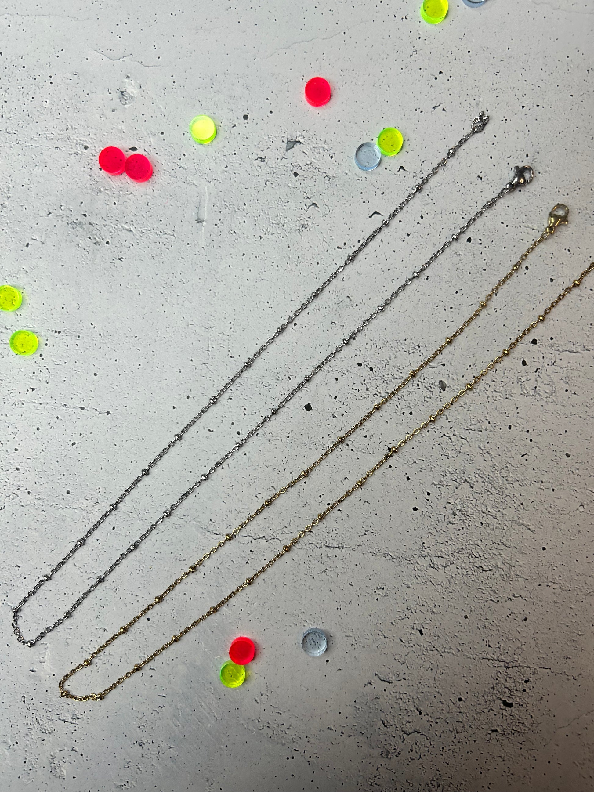 Satellitenkette Edelstahl / Edelstahl vergoldet. 45 cm Länge. Von kleinen Edelstahl-Satelliten (Perlen) durchsetzte feingliedrige Kette.