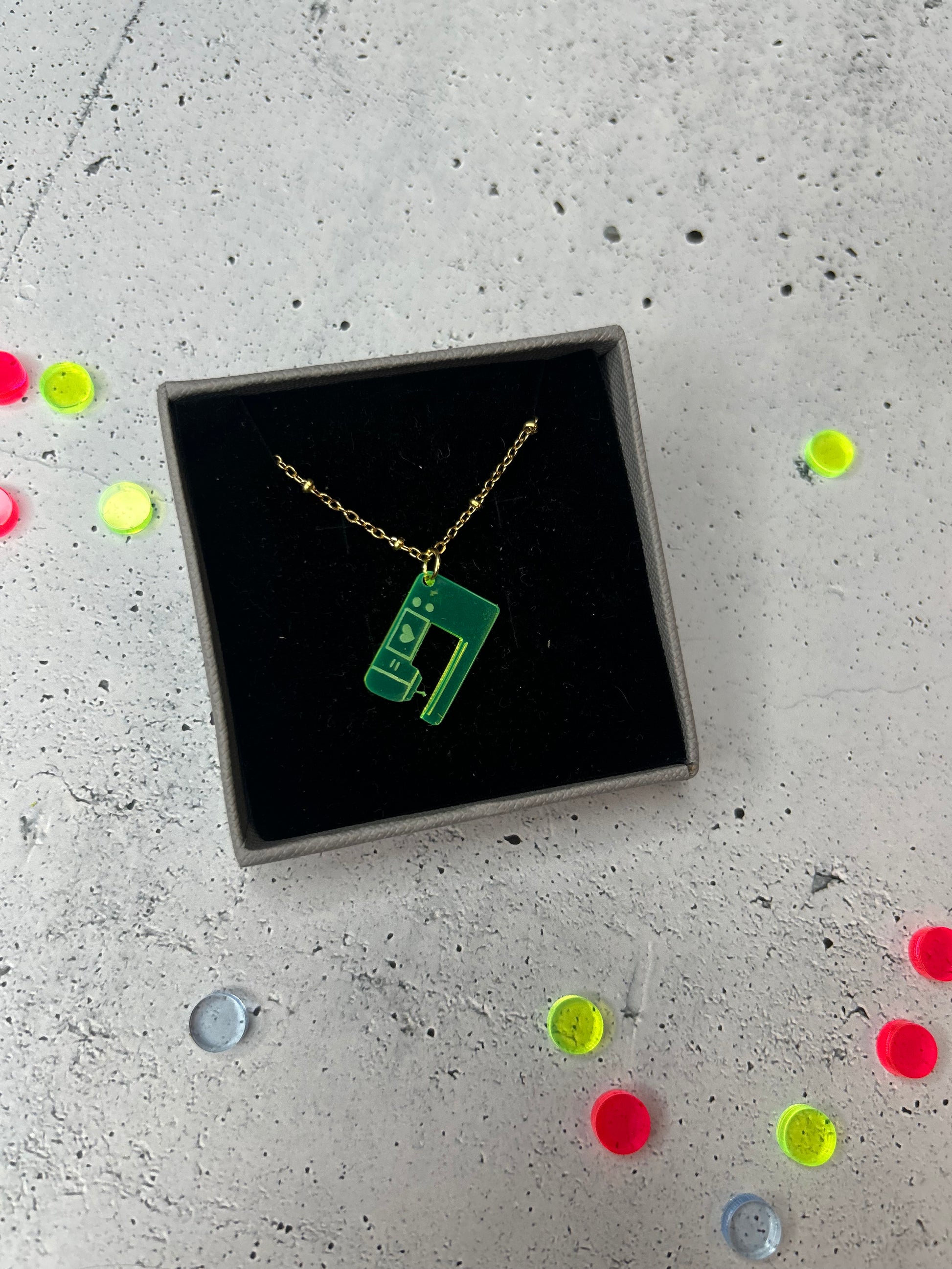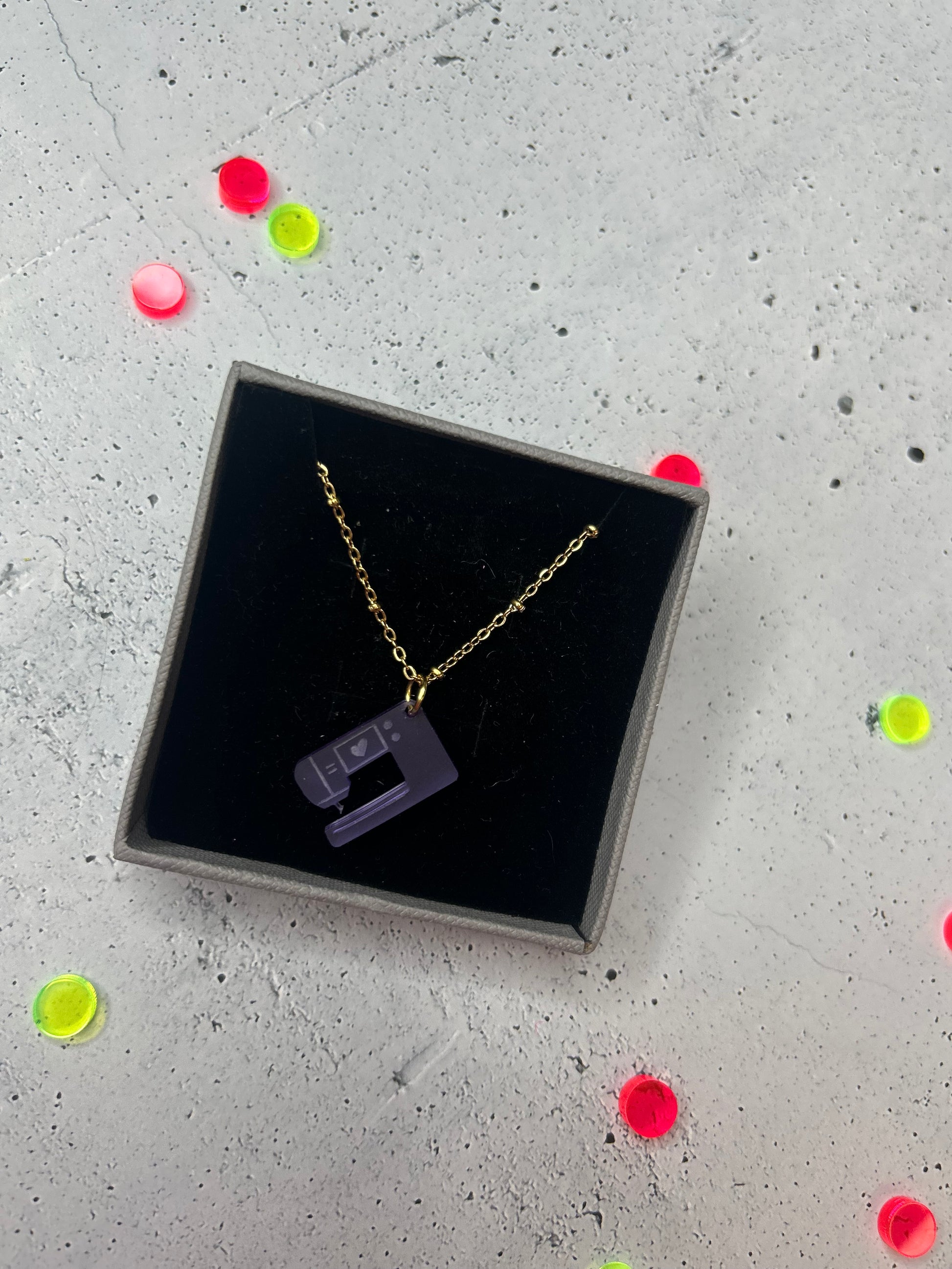 Die Kollektion umfasst Anhänger aus kunterbuntem, robusten Acryl rund ums Thema nähen. Ob Nähmaschine, Garnrolle, Schere oder Statementschriftzug - zeige deine Leidenschaft, indem du sie als Kette oder Ohrringe trägst.